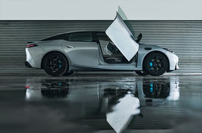 车身侧面采用了溜背式的轿跑风格设计,车身腰线贯穿至尾部,隐藏式的门把手搭配较为平整的车门,让新车的整体造型看上去干净利落。此外,新车还配备了五辐式的轮圈,并搭配了亮色的制动卡钳。车尾部,新车采用狭长的灯组设计,后包围则搭配了尾部扩散器装饰,进一步提升运动属性。